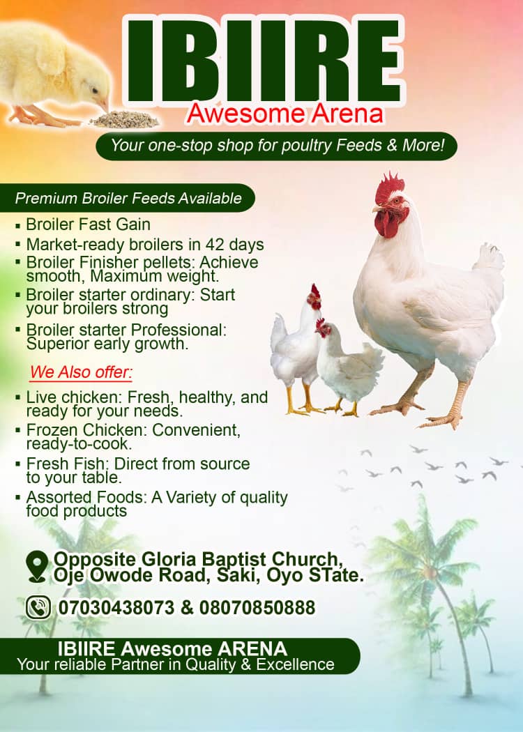 Introducing IBIIRE Awesome ARENA, your premier destination for top-quality poultry products and more, located in Saki, Oyo State. Situated opposite Gloria Baptist Church along Oje Owode Road, IBIIRE Awesome ARENA is committed to offering everything you need for successful poultry farming and premium food products.